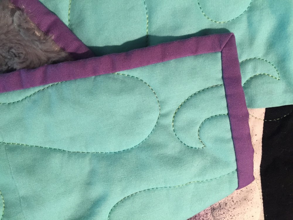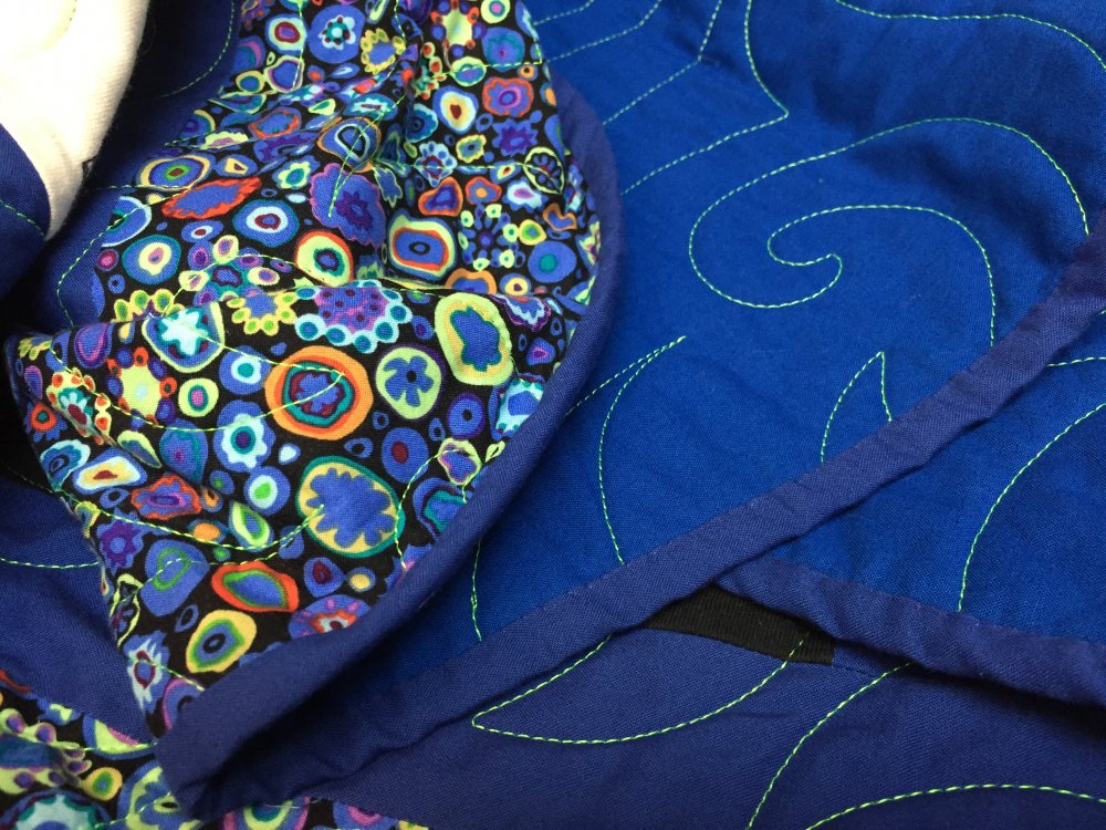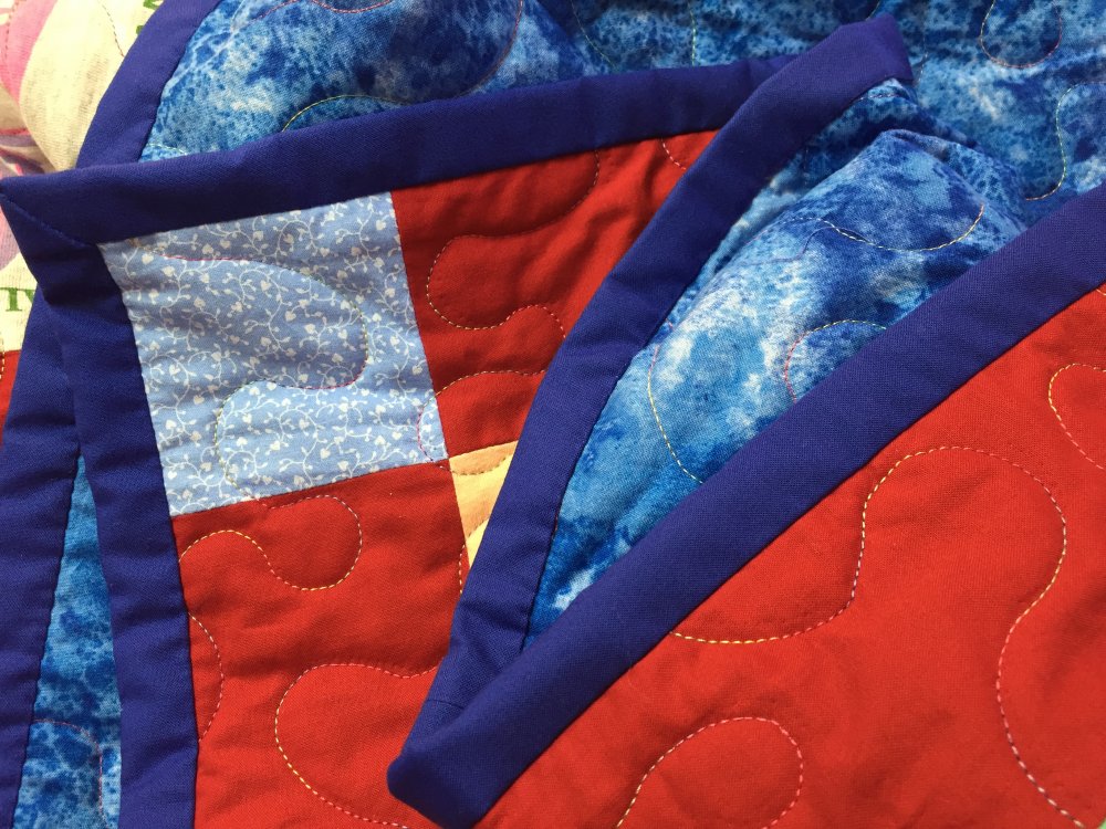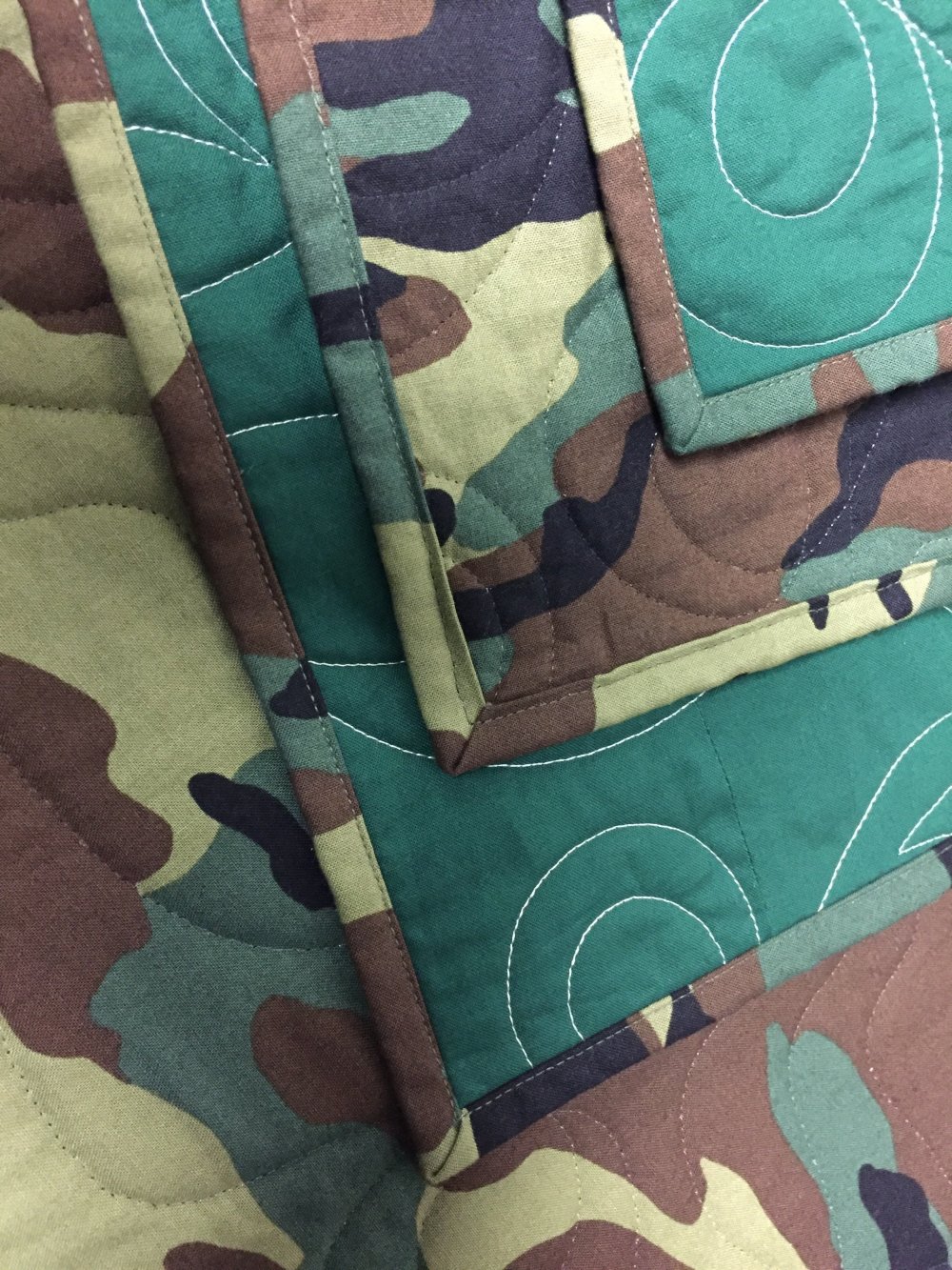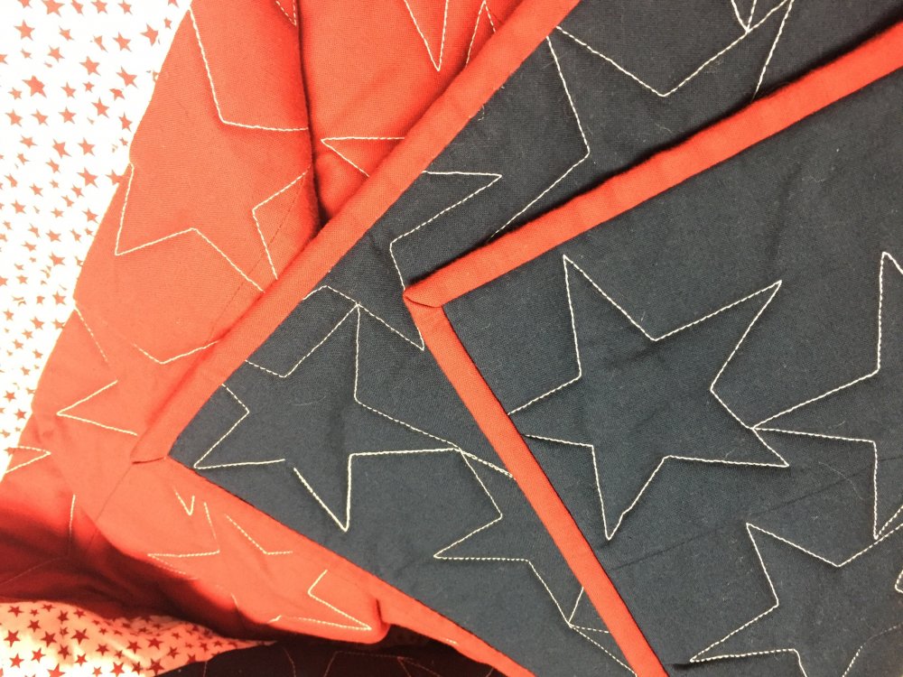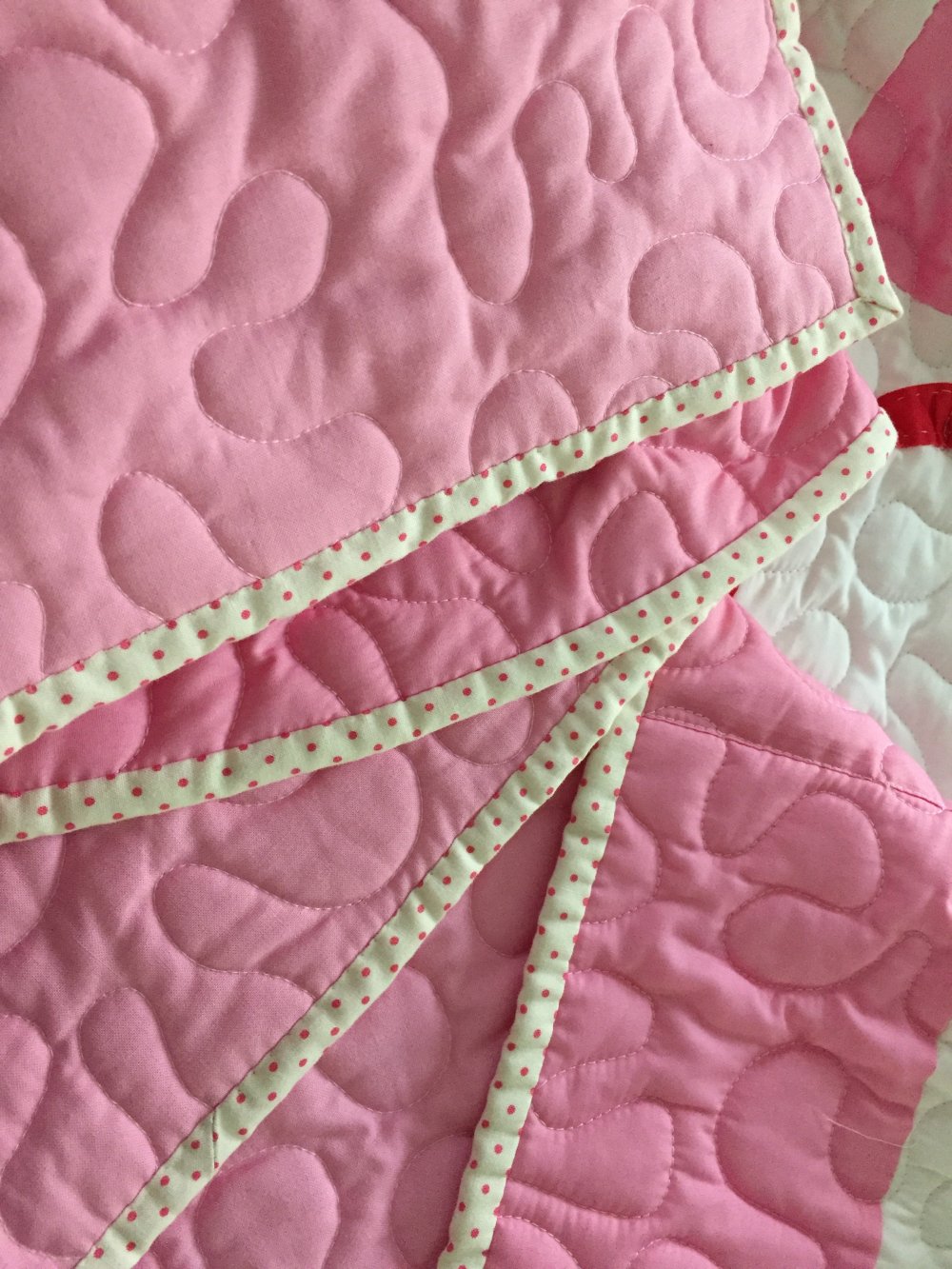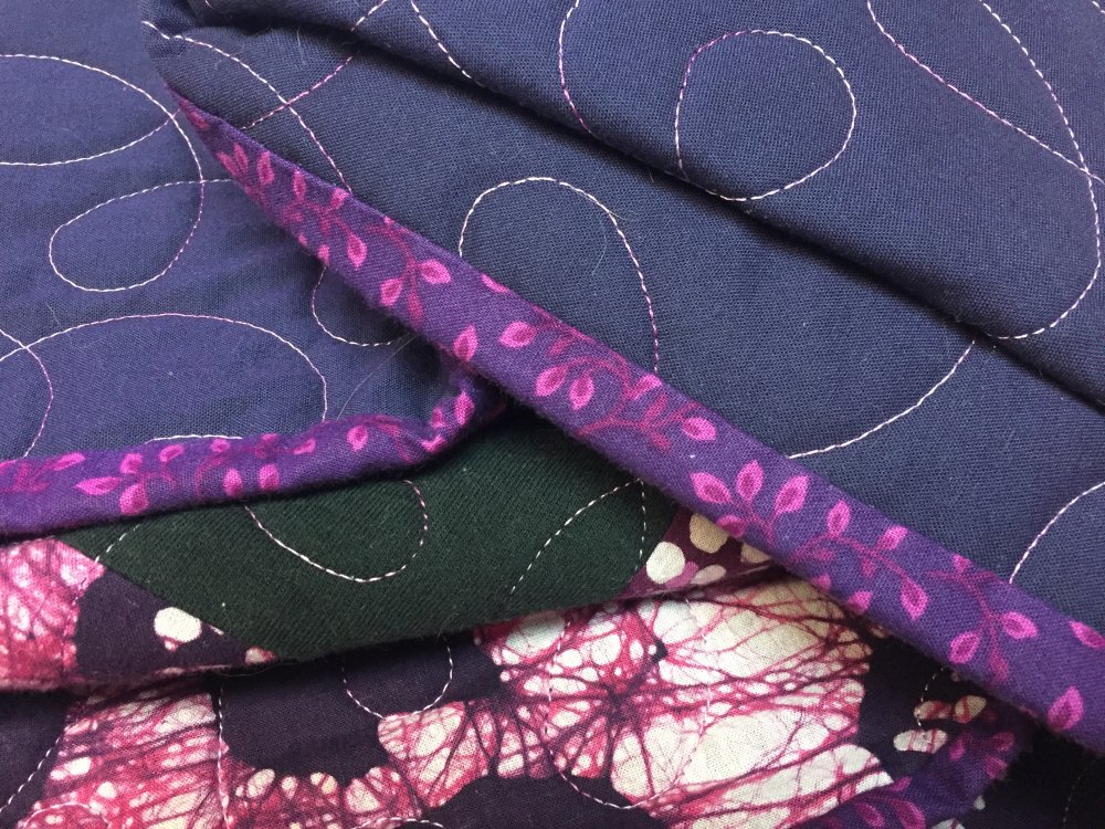 The binding finishes the quilt by neatly concealing the raw edges of all of the layers. We use 100% cotton fabrics. Once made the binding is machine sewn to the front edge of your quilt and then hand sewn to the back. Hand sewing provides a professional finish as the stitches do not show through to the top of the quilt. Here are some examples of our work.