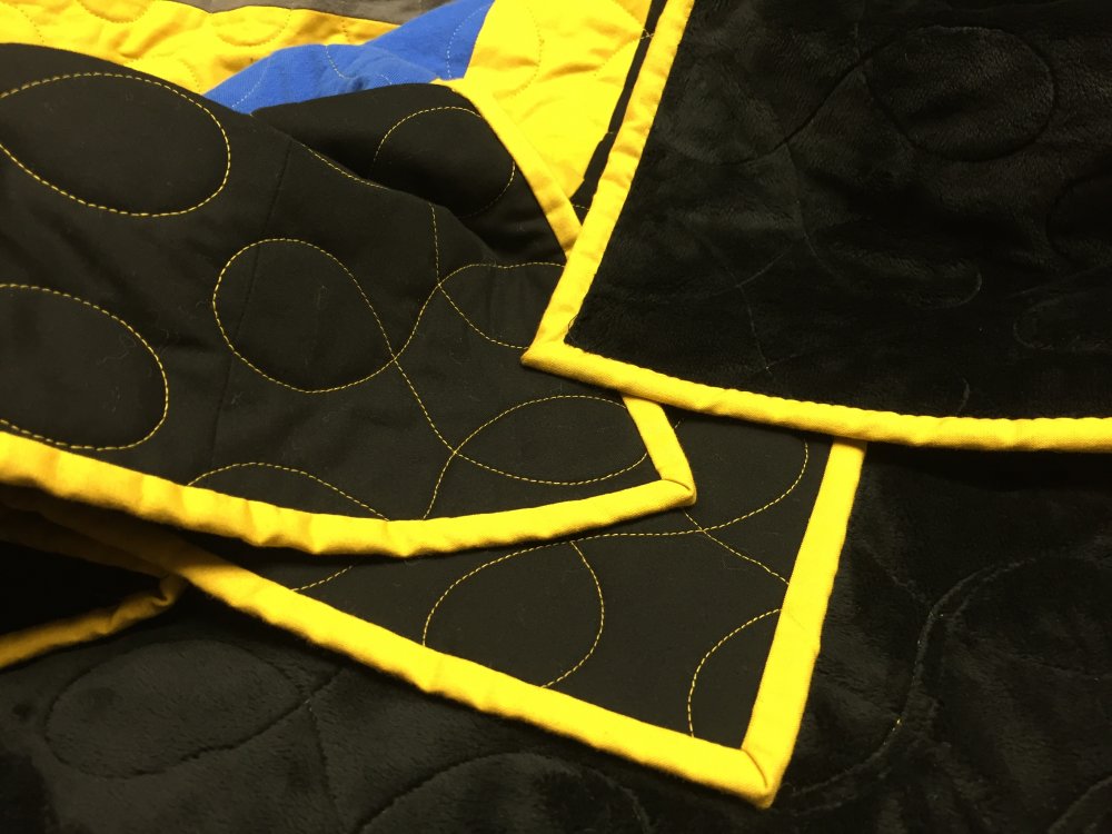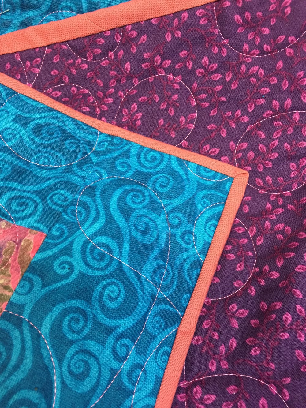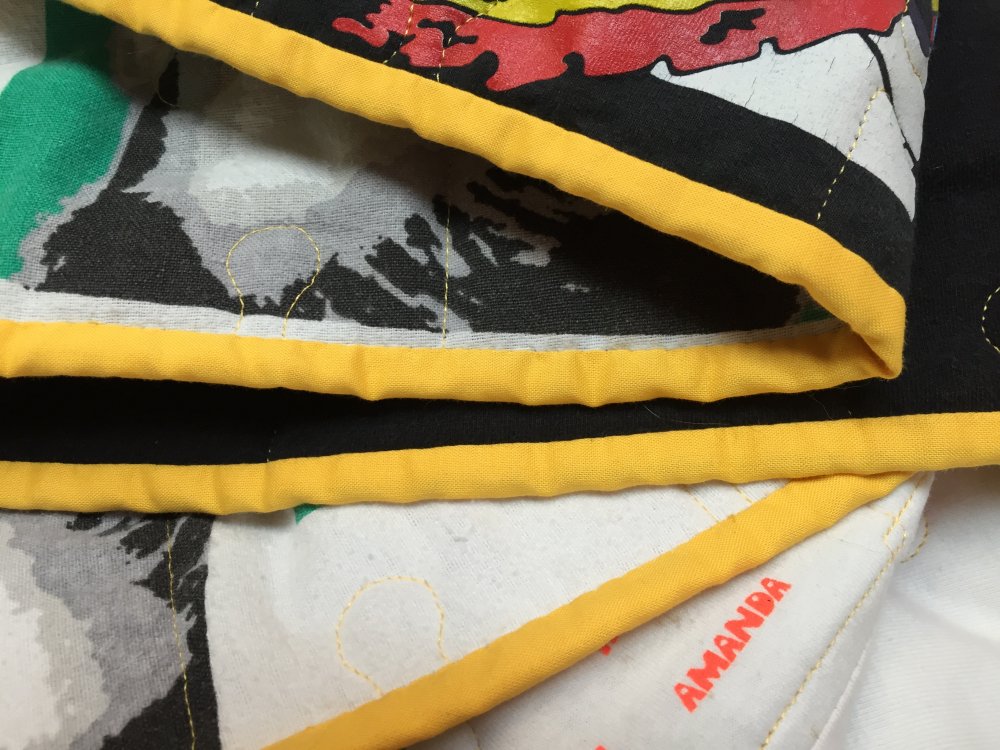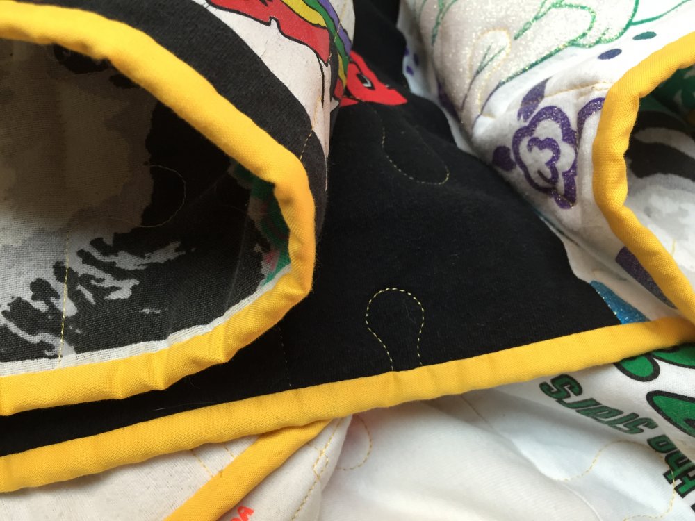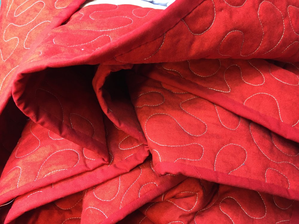 The binding finishes the quilt by neatly concealing the raw edges of all of the layers. We use 100% cotton fabrics. Once made the binding is machine sewn to the front edge of your quilt and then hand sewn to the back. Hand sewing provides a professional finish as the stitches do not show through to the top of the quilt. Here are some examples of our work.