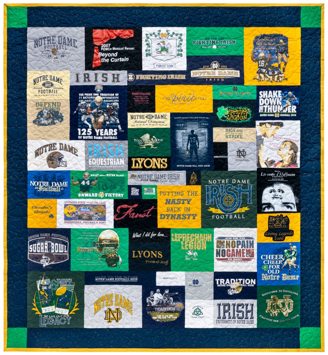 How many shirts do I need for my quilt? As many as you’d like. We have created a wall hanging quilt with 1 tshirt and a double sided quilt with 120 shirts and items on one side and 80 on the other! What we need to know is what type of quilt you would like and how many shirts or items would you like to include? We can make it any way and start by creating a design specific for your particular items.