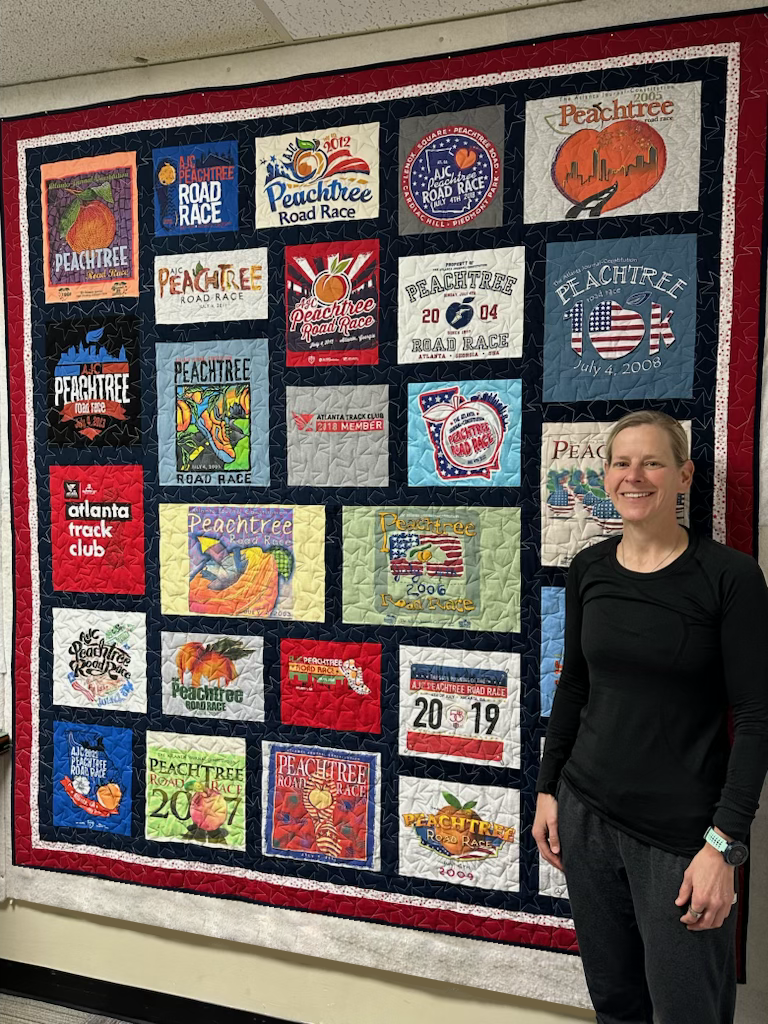 Consider the look of romance as a way to remember events shared with your significant other! Here we used 2 of the same t-shirts earned from running the Peachtree Road Race and shaped them in to hearts as a testament to the couples love and passion for running together over the years. Zoom in to see the quilting —running shoes! Quilting makes it a quilt! This is one of many designs that are available to personalize your masterpiece. There are many different ones with shoes and others such as crossing the finish line with your arms raised. We have over 500 designs and if you don’t see one that resonates with you, we can help to find something that you like.