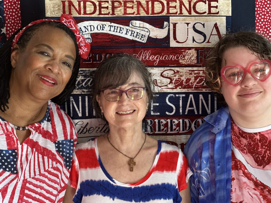 For the 4th of July we all decided to wear red, white, and blue. Hope you had a nice holiday. I enjoyed having a few days off. Though it was odd at first to have nothing to do but sleep, relax, go to the pool and repeat. The top pic is a quilt in the making. We added patriotic borders to this One Nation Under God America panel. To continue the theme, we’ll probably quilt it with white stars.