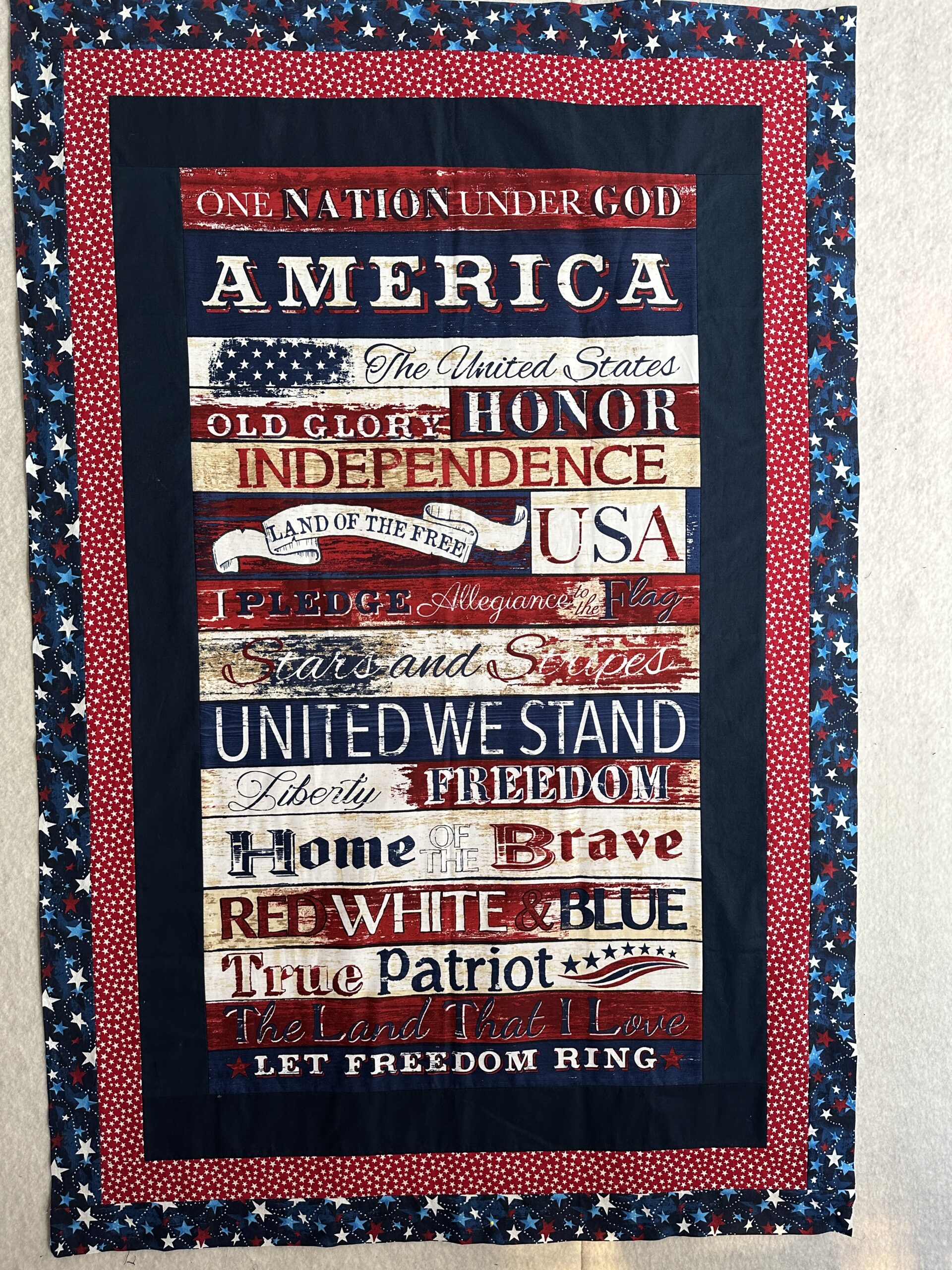 For the 4th of July we all decided to wear red, white, and blue. Hope you had a nice holiday. I enjoyed having a few days off. Though it was odd at first to have nothing to do but sleep, relax, go to the pool and repeat. The top pic is a quilt in the making. We added patriotic borders to this One Nation Under God America panel. To continue the theme, we’ll probably quilt it with white stars.