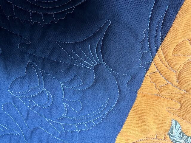 Masonry includes a border going all around the outside edge. Navy is show on the fishing quilt. The back fabric is your choice and also the quilting design and thread. The quilting design is fish! The quilting is functional in that it connects all of the layers. This prevents shifting and stretching over time. The fish also really help to further personalize the quilt.