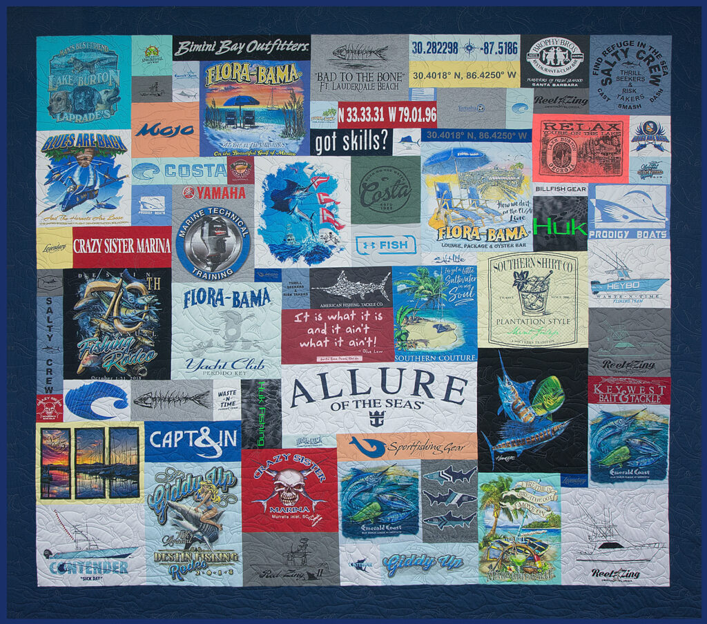 The style of this quilt is Masonry. It’s ideal if you have items that vary drastically in size. The white Allure shirt, for instance, is way bigger than the Flora Bama piece directly below it on the left. Looking over the quilt there are many other examples of large and very small pieces. We can make it work once we know for sure what you want to include. Let us know if you do need for your quilt to be a certain size. That can be influenced by adding or subtracting shirts or fabric to get to something you like.