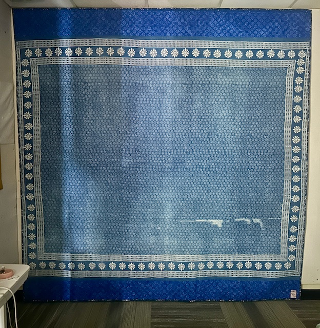 The quilting was done in a metallic thread. She liked the way that it shimmered in the stars used in her quilting design. The binding goes all around the outside edge and for that she continued her blues in a navy dot print. Everything came together nicely.