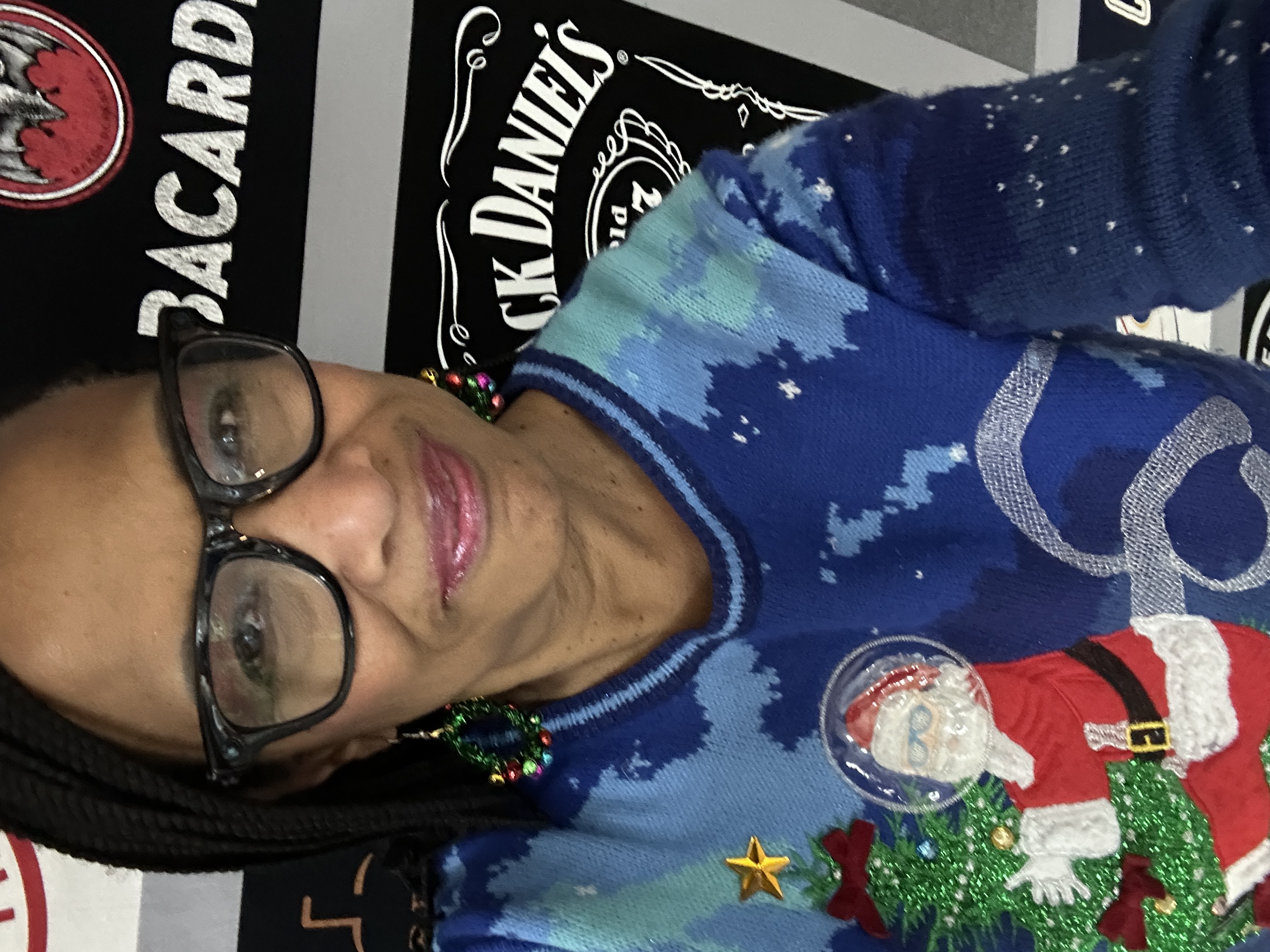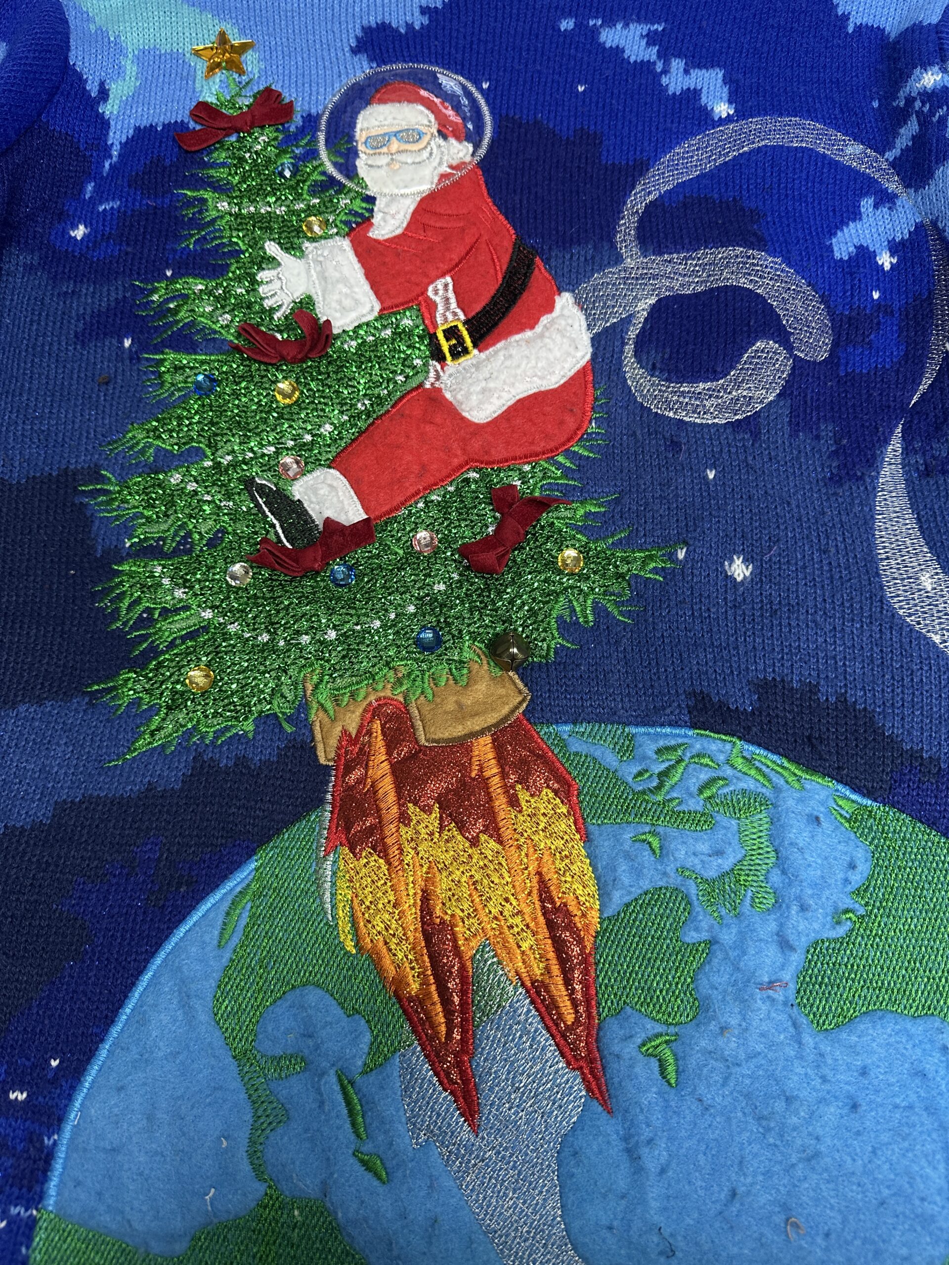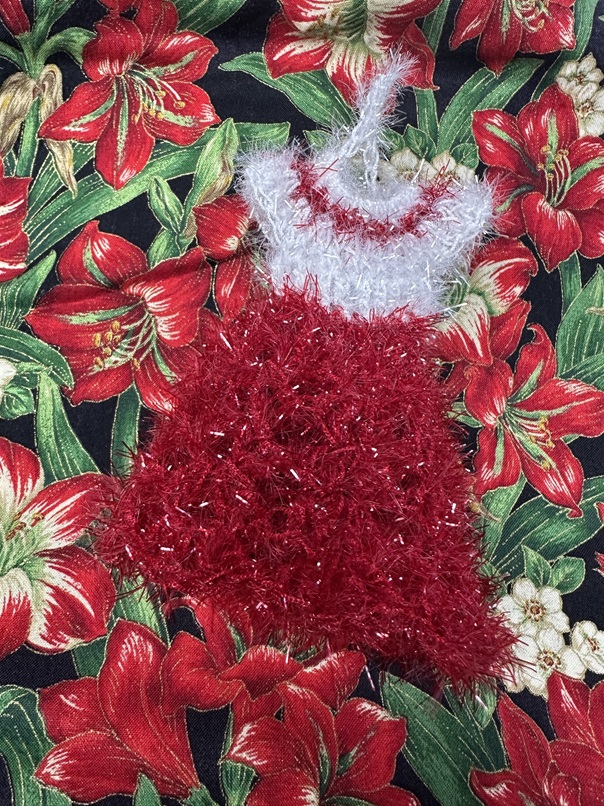 From the pictures, the Santa sweater I got at an estate sale and it’s my favorite to wear this time of the year. Duk Sun is Korean and brought by this small gift. It’s to scrub things. I think it’s too pretty to use for that. Working with crafty people means you may just get original crafty homemade gifts !