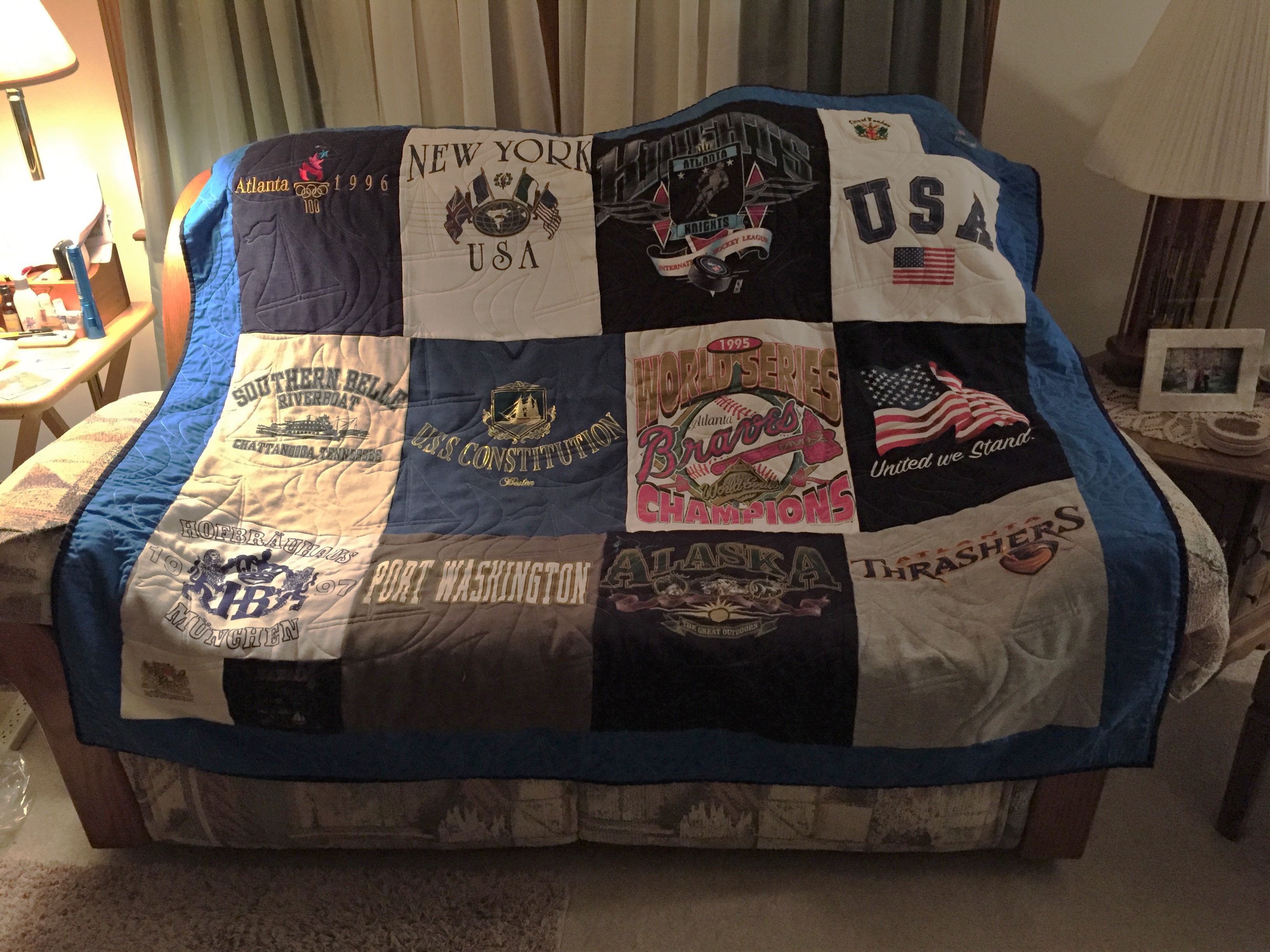 Angie’s t-shirt quilt was for her son’s graduation. She came by to pick it up. She’d had a hectic week of travel. She was wearing a red and black Atlanta Falcons shirt and cap. I see the beginnings of a smile before she leaves. Didn’t want you to treat me any different, Kyle, but just want you to know that “Arthur and I are engaged”. Arthur, I thought. “By the way Debi, his office manager, may be contacting you for a t-shirt quilt. We wanted to see how this one turned out first”.