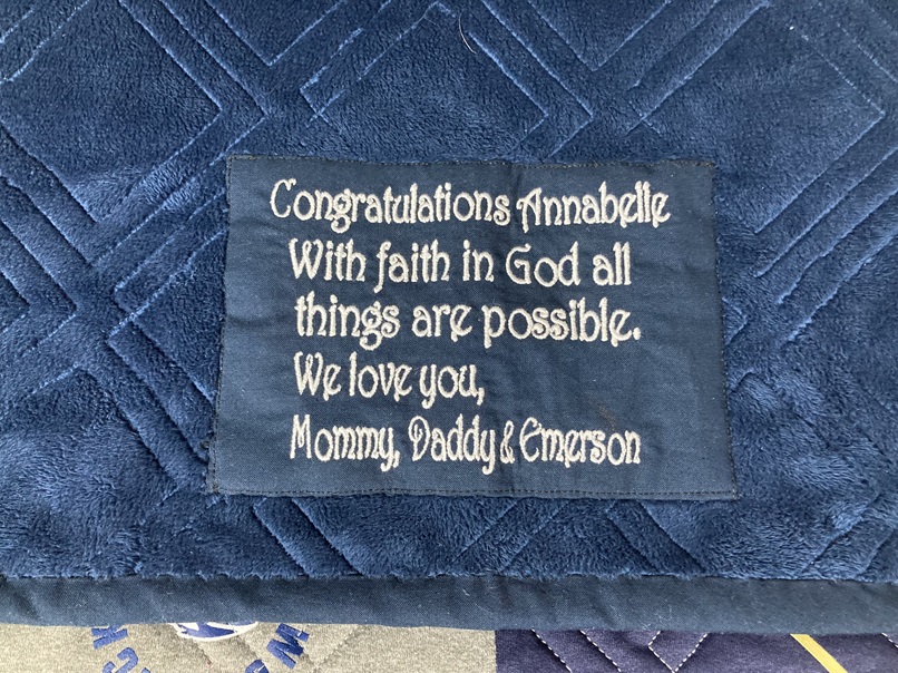 Mom put a lot of thought into what she wanted for her daughter. With all of her requirements in place, we got started. It was completed in time to gift as a Christmas present which she did. Her daughter “loved it”. Gifting the finished quilt at Christmas extends the celebration to May. With Christmas taken care of, now Mom has plenty of time to come up with a May graduation present!