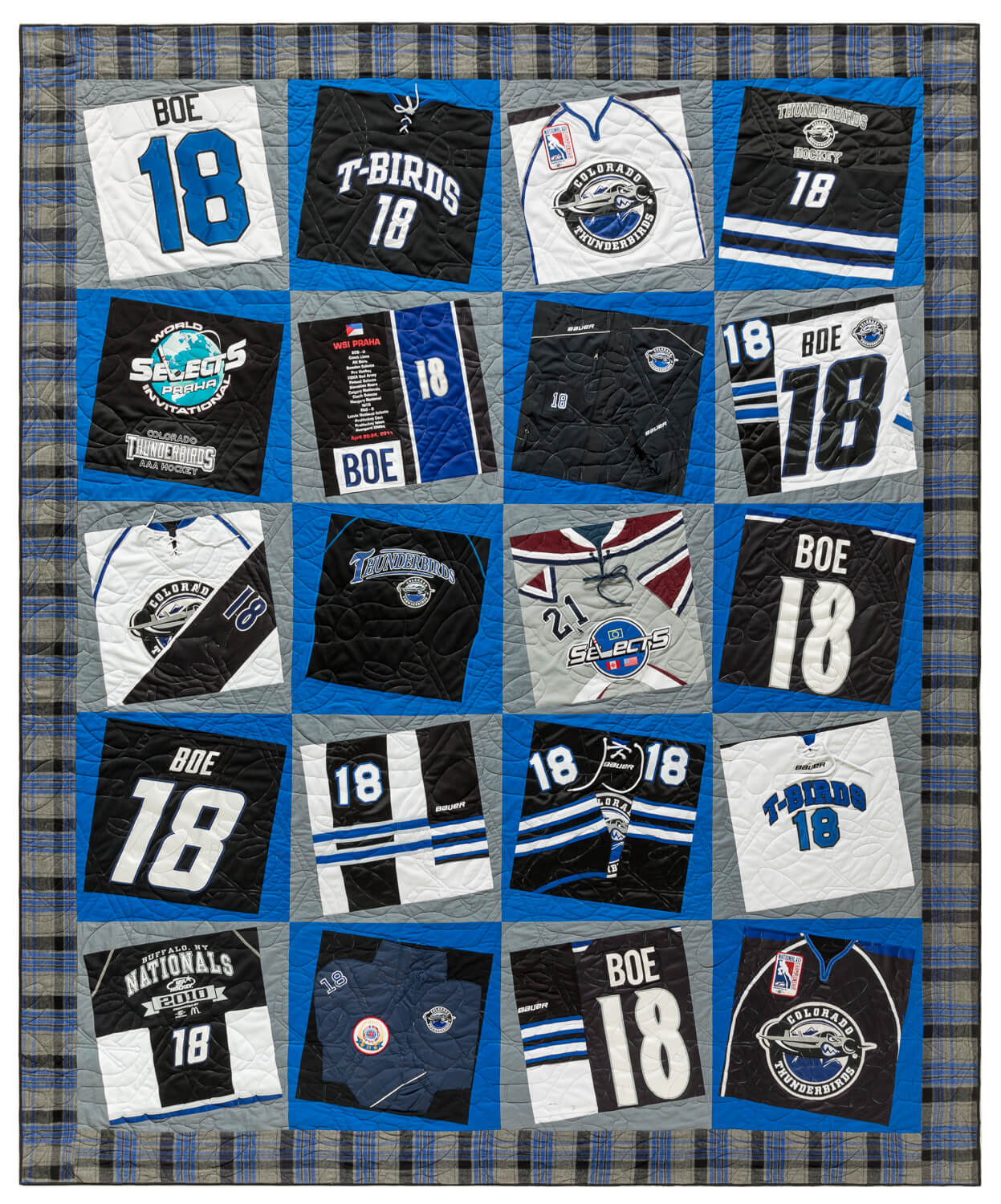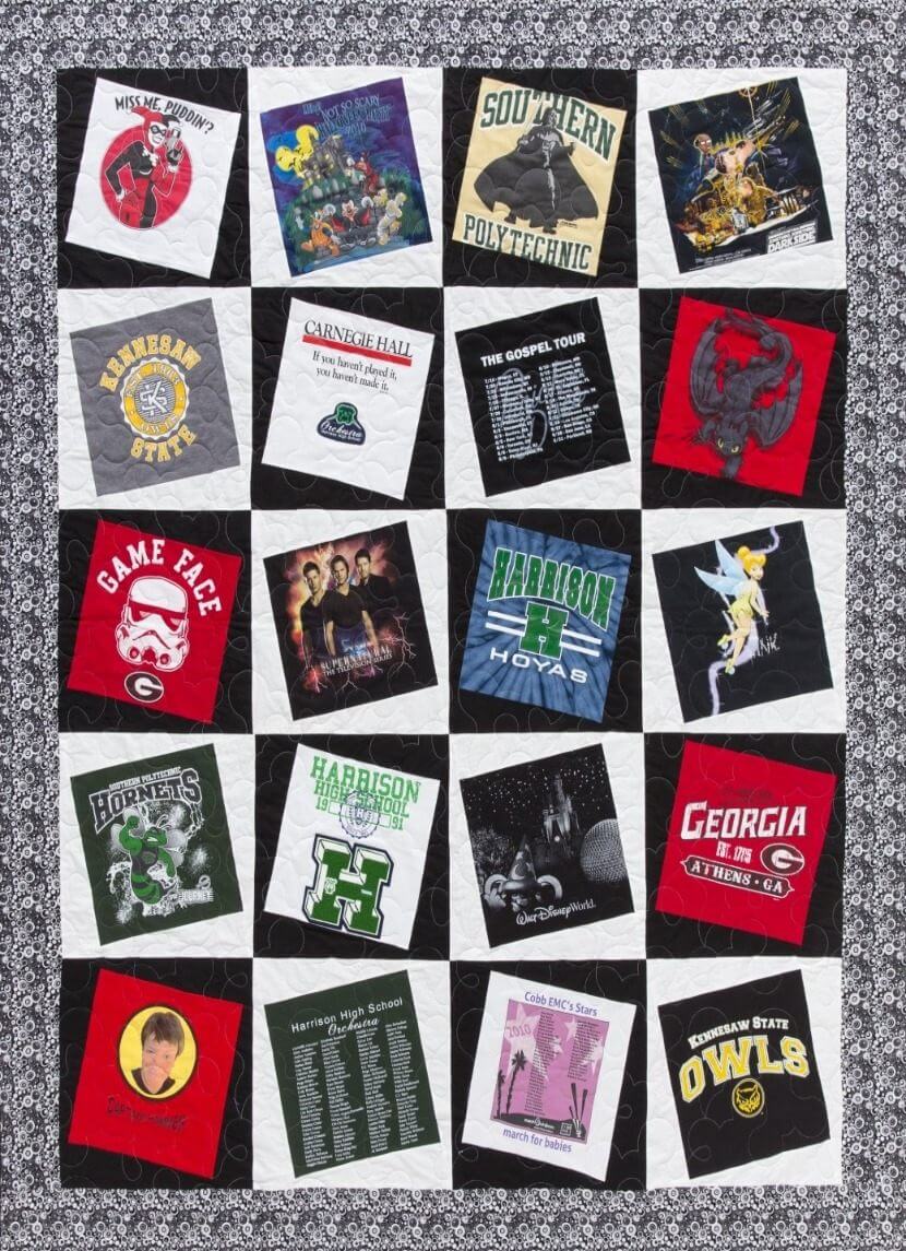 With Wonky your special shirts are on an angle creating an illusion of movement. They are all trimmed the same size and surrounded by 2 alternating fabrics of your choice cut into isosceles triangles. This style is good if you like a bit of asymmetry within the structure of a grid.